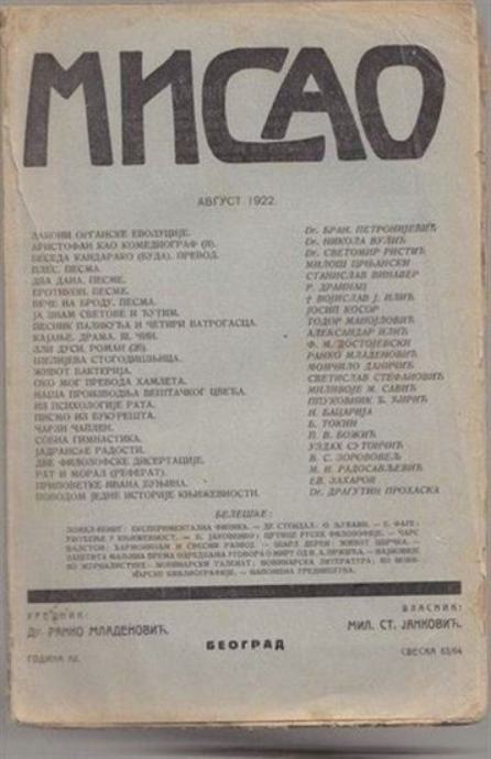 Misao, serbian avangarde magazine –august 1922. 16x24 cm, 240 pages. Editor Ranko Mladenovic. Wrote Milos Crnjanski, Stanislav Vinaver, Todor Manojlovic, Bosko Tokin... Condition fine