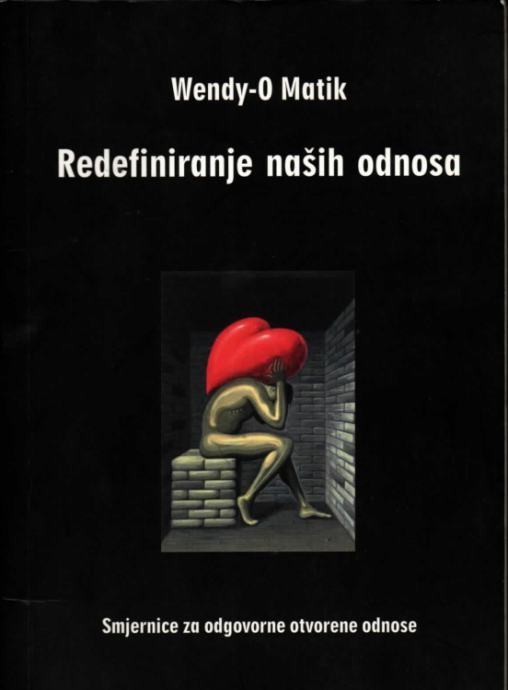 "Redefiniranje naših odnosa" intrigantna je i korisna knjižica koja uvodi u beskrajne mogućnosti otvorenih odnosa. U društvu u kojem je monogamija bogom dani presedan i jedina prihvatljiva ljudska priroda, ona je više nego dobrodošla. Knjiga pobija predrasude o otvorenim odnosima kao neodgovornim i površnim, te pokazuje kako upravo za njih treba maksimum odgovornosti, preispitivanja, iskrenosti i razgovora. Bit takvih odnosa je istinsko prijateljstvo utemeljeno na neograničenom povjerenju koje ne prestaje bez obzira na promjene unutar tog odnosa. Ako stvarno volimo nekog, taj odnos se nikad ne prekida, samo se razvija u drugačijim smjerovima i te osobe na drugačije načine i dalje sudjeluju u našim životima. Na taj način nema povrijeđenih, ni ostavljenih.Stranica: 52Jezik: ZagrebPismo: LatinicaStanje: Rabljena, očuvana knjigaUvez: MekiGodina: 2008