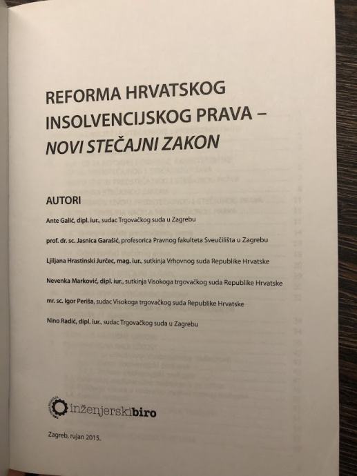 Zbornik radova Reforma hrvatskog insolvencijskog prava - novi Stečajni zakon, u izdanju Inženjerskog biroa d.d, Zagreb, a sadrži radove u kojima se daje prikaz novina te se razmatraju aktualna pitanja primjene novog Stečajnog zakona (Nar. nov., br. 71/15), ali i osnovne novine koje sa sobom donosi reforma Europske uredbe o insolvencijskim postupcima. Novi Stečajni zakon stupio je na snagu 1. rujna 2015., sadrži i odredbe koje uređuju predstečajni postupak koji će provoditi sud uz tehničku pomoć FINA-e te donosi niz novina u odnosu na provedbu predstečajnog i stečajnog postupka kojima se nastoje otkloniti uočeni propusti učinjeni donošenjem Zakona o financijskom poslovanju i predstečajnoj nagodbi (Nar. nov., br. 108/12, 144/12, 81/13 i 112/13) i Zakona o izmjenama i dopunama Stečajnog zakona (Nar. nov., br. 133/12).