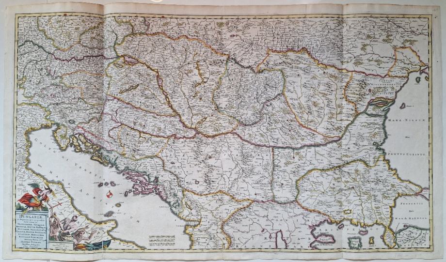 Frederik de Wit: Regni Hungariae et regionum, quae ei quondam fuere unitae, ut Transilvaniae, Valachiae, Moldaviae, Serviae, Romaniae, Bulgariae, Bessarabiae, Croatiae, Bosniae, Dalmatiae, Sclavoniae, Morlachiae, Ragusanae Reipublicae, maximaeq[ue] partis Danubii Fluminis, novissima delineatio.Fantastična velika karta središnje Europe, koja prikazuje regiju od Italije do Rumunjske i Crnog mora, pa sve do Krakowa i Praga na sjever. Ova karta uključuje veliku količinu detalja, brojnih gradova i rijeka. Crvenom bojom označeni su važni gradovi poput Bukurešta, Beča i Carigrada.Karta je posebno zanimljiva zbog potpunog zanemarivanja bilo kakvog spominjanja Osmanskog Carstva. Ova karta je objavljena u vrijeme kada je Osmansko Carstvo još uvijek kontrolirao dijelove regije, ali mu je važnost brzo opadala. Mnogi u kršćanskom svijetu nastojali su umanjiti važnost Carstva, što je moguće pridonijelo ovoj značajci. Osim toga, političke granice stalno su se iscrtavale, što znači da je bilo bolje pozivati se na povijesne regije u kartografiji.Karta uključuje ukrasnu kartušu u donjem lijevom dijelu, uključujući portret habsburškog vladara. Ovu je kartu izvorno objavio Fredrik de Wit 1688. Dimenzije: 49x87Jezik: AmsterdamPismo: LatinicaStanje: Vrlo dobroUvez: MekiGodina: 1688