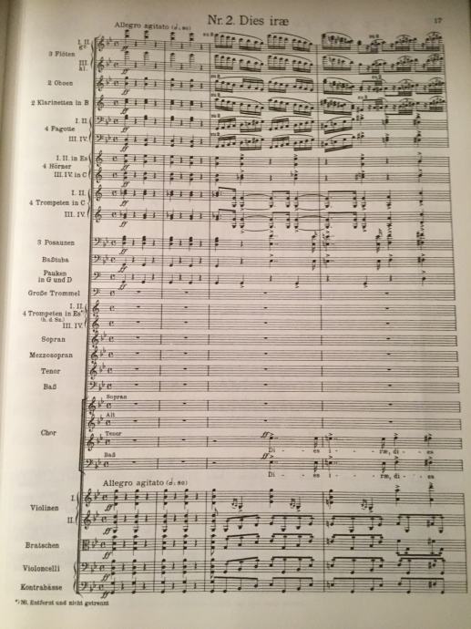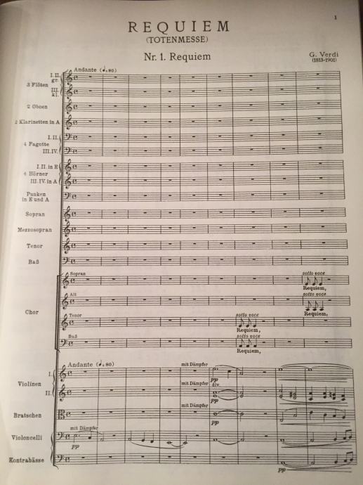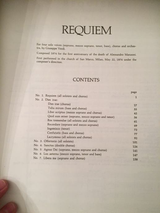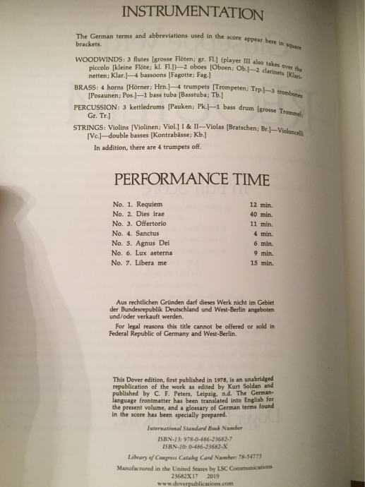 Scored for four solo voices (soprano, mezzo soprano, tenor, bass), chorus, and orchestra, the Requiem is divided into seven sections: