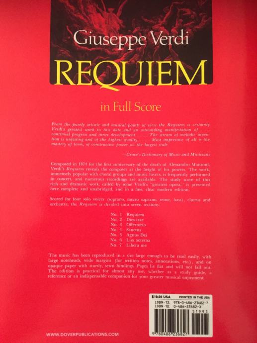 Composed in 1874 for the first anniversary of the death of Alessandro Manzoni, Verdi's Requiem reveals the composer at the height of his powers. The work, immensely popular with choral groups and music lovers, is frequently performed in concert, and numerous recordings are available. The study score of this rich and dramatic work, called by some as Verdi's greatest opera, is presented here complete and unabridged, and in a fine, clear modern edition.