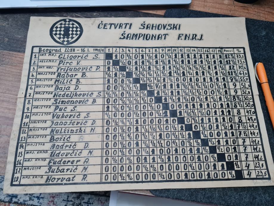 Rućno pisani rezultati, šahovska povijest, jedinstveni kolekcionarski primjerak, prvak Svetozar Gligorić, fotografija...