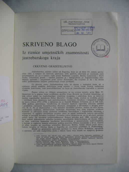 Skriveno blago - Iz riznice umjetničkih znamenitosti jastrebarskog kraja - edicija Kulturni i prirodni spomenici Hrvatske; Zbirka vodiča časopisa "Kaj", izdavač Društvo "Kajkavsko spravišče", Zagreb 1975. godine, 17 x 24 cm, meki uvez, 56 stranica, ilustrirano.