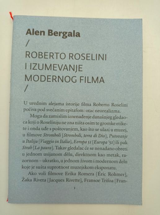 Alain Bergala: Roberto Roselini i izumevanje modernog filma »U Rosselinijevim filmovima samo jedan korak dijeli skandal od čuda. A ponekad je potreban cijeli film da se taj korak prijeđe.«Stranica: 35Dimenzije: 10x15Jezik: BeogradPismo: LatinicaStanje: Nova knjigaUvez: MekiGodina: 2018