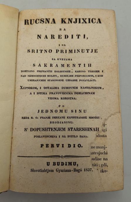 Marijan Jaić: Rucsna knjixica za narediti i na sritno priminutje sa svetim sakramentih, Budim 1837.g.Marijan Jaić ( brod na Savi 1795- Budim 1858.) poznati je hrvatski franjevac. Bio je skladatelj i pisac. Jaićeva "Ručna Knjižica" je starohrvatski priručnik za pokapanje umrlih. Pisan je u formi ručne knjižice kako bi se priručnik širio od ruke do ruke tj. od čovjeka do čovjeka. Knjiga je u vrlo dobrom stanju. Sastoji se od dva dijela koji su zajedno uvezani. Prvi dio ima 270.str., a drugi 256. str. Stranica: 8 270 256Dimenzije: 12x18Jezik: MađarskaPismo: LatinicaStanje: Vrlo dobroUvez: MekiGodina: 1837