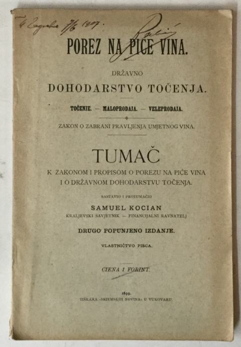 Samuel Kocian: Tumač k zakonom i propisom o porezu na piće vina i o dr