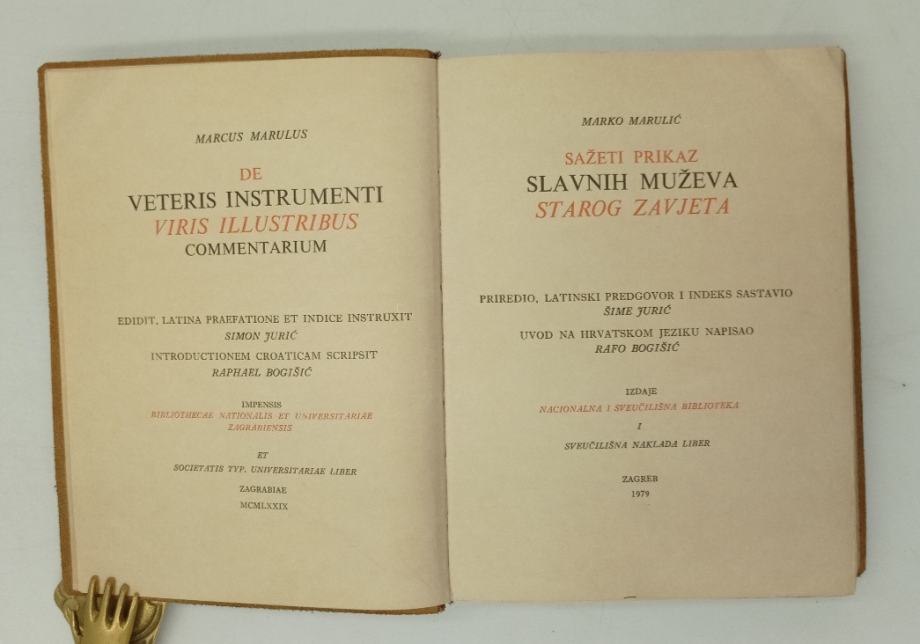 Marko Marulić: Sažeti prikaz slavnih muževa Starog zavjeta-De veteris instrumenti viris illustribus commentarium (luksuzni uvez u koži)Sažeti prikaz slavnih muževa Starog Zavjeta. Faksimil pisan Marulićevom rukom, otkriven 1976. Priredio, latinski predgovor i indeks sastavio Šime Jurić, uvod na hrvatskom napisao Rafo Bogišić. Dimenzije: 18x23Jezik: ZagrebPismo: LatinicaStanje: OdličnoUvez: TvrdiGodina: 1979