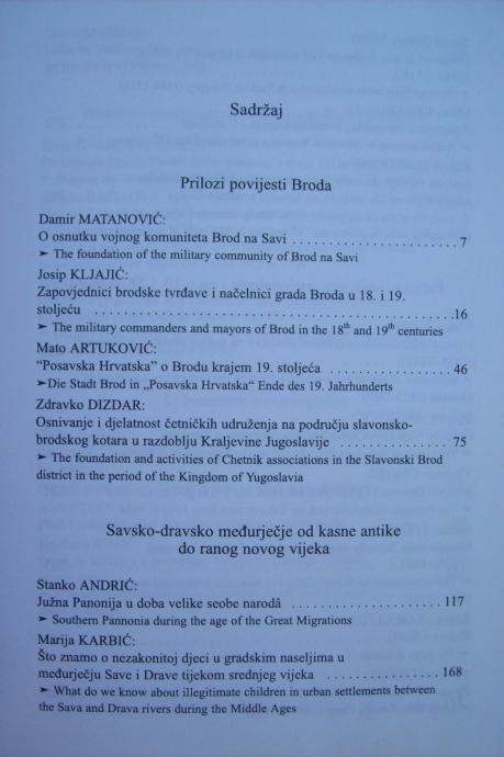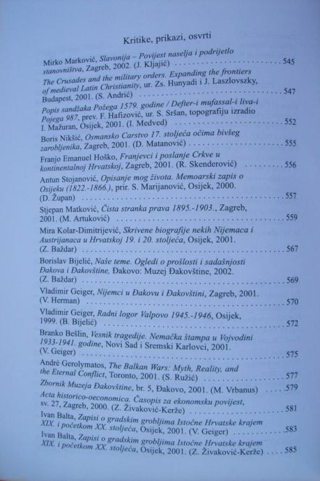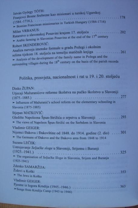 Manje priloge iz povijesti Slavonije, Srijema i Baranje dali su Mijat Sto-janović, Gjuro Szabo, Antun Bauer. Temeljno djelo za period oslobođenja Slavonije od Turaka (s dokumentacijom) dao je Tadija Smičiklas. Vrijedan doprinos povijesti Slavonije, osobito agrarnih odnosa, dao je Josip Bosendor-fer. Valja spomenuti doprinos Ferde Sišića za povijest Virovitičke županije, raznih tema iz srednjeg vijeka Vjekoslava i Nade Klaić, opširnu studiju Požege Julija Kempfa i Mirka Markovića o Slavonskom Brodu, te studije o gospodarstvu Osijeka Zlate Živaković-Kerže. Napose treba istaknuti vrijedne znanstvene doprinose koje je svojim studijama i zbirkama dokumentarne građe dao Ive Mažuran. Gospodarskoj povijesti Slavonije poseban doprinos dao je Igor Ka-raman. Uz njih svakako treba izdvojiti doprinose Josipa Adamčeka, Josipa Bu-turca, Dragutina Pavličevića, Filipa Potrebice, Stjepana Sršana i u novije vrijeme Stanka Andrića o raznim pitanjima političke, državnopravne, gospodarske, demografske, vojne, crkvene i kulturne povijesti ovih zemalja. Bibliografija radova ovih istraživača lako je svima dostupna.