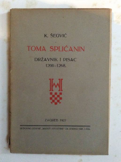 ŠEGVIĆ, TOMA SPLIĆANIN, DRŽAVNIK I PISAC, ZAGREB 1927., MATICA HRVATS