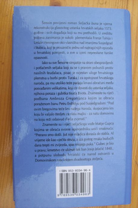 Šenoin povijesni roman Seljačka buna je vjerna rekonstrukcija glasovitog ustanka hrvatskih seljaka 1573. godine i svih dogadaja koji su mu prethodili. U središtu piščeva zanimanja je sukob plemenitaša Franje Tahija i Uršule Heningove oko vlasništva nad imanjima Susjedgrad i Stubica, koji je prouzročio jednu od najtragičnijih epizoda u hrvatskoj povijesti, a sve u sjeni neprestane turske opasnosti. Lako su sve Šenoine simpatije na strani obespravljenih i potlačenih seljaka koji su se s pravom pobunili protiv nasilnih feudalaca, pisac je svjestan uloge hrvatskoga plemstva u borbi protiv Turaka i za opstojnost hrvatskoga naroda, pa mu utoliko teže padaju krvavi obračuni medu posvađanim velikašima, koji če dovesti do ustanka seljaka, njihova poraza i gubitka tisuća života. Znamenite su riječi podbana Ambroza Gregorijanca kojim se obraća poraženom banu Petru Erdodyu pod Susjedgradom: „Pod ovim bregovima teče krv našega naroda, skupocjena krv koju bi valjalo štedjeti za našu majku – za…