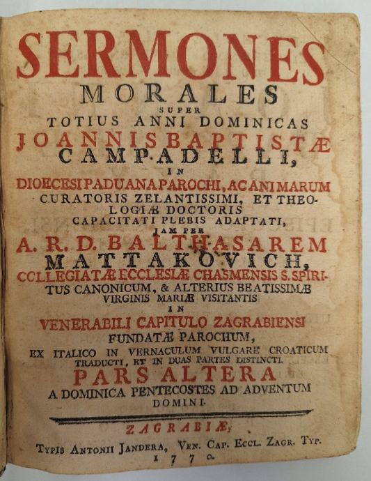 Baltazar Matković: Sermones morales super totius anni Dominicas, Joannis Baptistae Campadelli in dioecesi Paduana parochi, ac animarum curatoris zelantissimi et theologiae doctoris capacitati plebis adaptati jam per a. r. d. Balthasarem Mattakovich ... ex Italico in vernaculum vulgare Croaticum traducti et in duas partes distincti. Jedan od najopsežnijih prijevoda propovijedi na hrvatski jezik u 18. stoljeću. Baltazar Mataković bio je čazmanski kanonik i župnik sv. Marije u Zagrebu. Preveo je tada zabranjene nedjeljne propovijedi i moralne pouke padovanskog župnika Giovannija B. Campadelle. Stranica: 528Dimenzije: 17.5x20.5Jezik: ZagrebPismo: LatinicaStanje: Vrlo dobroUvez: TvrdiGodina: 1770