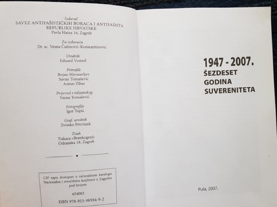 Šezdeset godina suvereniteta 1947-2007. - izdavač Savez antifašističkih boraca i antifašista Republike Hrvatske, Pula 2007. godine, 13 x 19 cm, meki uvez, 112 stranica, ilustrirano.