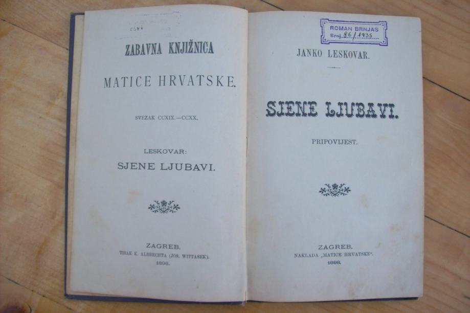 Janko Leskovar (Valentinoco, 1861. – Valentinovo, 1949.) Pripovjedač. U književnost je ušao tek kao tridesetogodišnjak objavivši u Vijencu novelu Misao na vječnost 1891. Sjene ljubavi, roman iz 1898. Zanimljivo je da je autorova verzija romana znatno cenzurirana. Prvo izdanje. Tvrdi uvez. Knjiga je u vrlo dobrom stanju.