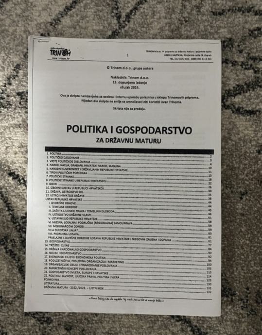 Trinom skripta za državnu maturu iz politike i gospodarstva, u odličnom stanju, nije uvezena, 2024. godina.