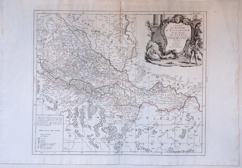 Pietro Santini: Carte du Royaume d'Esclavonie et du Duche de SyrmieItalija, 1783.g.Dimenzije: 74.5x52 cmPrekrasan Santiniev zemljovid Slavonije.Kartuša je ukrašena Trenkovim pandurom i djevojkom.Carte du Royaume d'Esclavonie et du Duche de Syrmie, dont l'un et l'autre est arrofe par le Danube, l'Illove, la Save, at la Drave Dimenzije: 74.5x52Jezik: VenecijaPismo: LatinicaStanje: OdličnoGodina: 1783