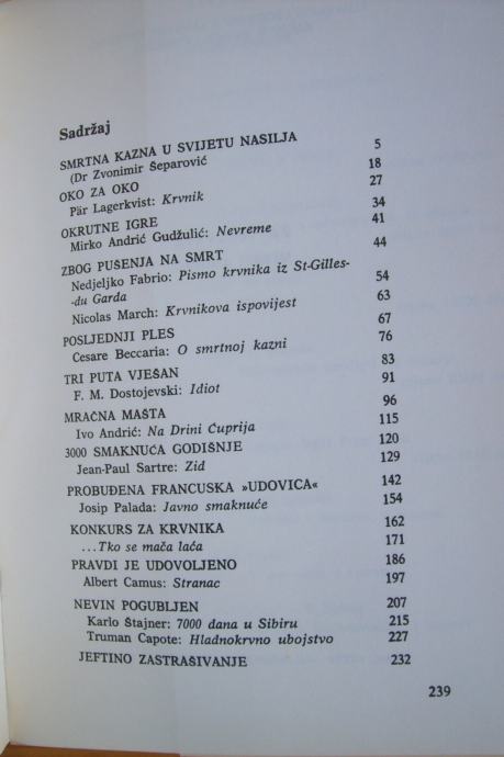 Knjiga je jedan od priloga problematici smrtne kazne. Pisana ležerno, građena na primjerima iz davnine i ovim novijeg datuma, angažirano sugerira ono isto što i abolicionisti svih vremena - treba razmisliti o opravdanosti smrtne kazne...Ovo je knjiga o osuđenima na smrt. Knjigu o smrtnoj kazni tek treba napisati.