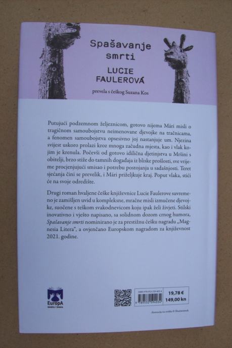 Putujući podzemnom željeznicom, gotovo nijema Mári misli o tragičnom samoubojstvu neimenovane djevojke na tračnicama, a fenomen samoubojstva opsesivno joj nastanjuje um. Njezina svijest uskoro prolazi kroz mnoga začudna mjesta, kao i vlak kojim je krenula. Počevši od gotovo idilična djetinjstva u Mršini s obitelji, brzo stiže do tamnih događaja iz bliske prošlosti, sve vrijeme procjenjujući smisao i potrebu postojanja u sadašnjosti. Teret sjećanja čini se prevelik, i Mári priželjkuje kraj. Poput vlaka, stići će na svoje odredište. Drugi roman hvaljene češke književnice Lucie Faulerove suvremeno je zamišljen uvid u kompleksne, mračne misli izmučene djevojke, suočene s teškom svakodnevicom koju ipak želi živjeti. Stilski inovativno i vješto napisano, sa solidnom dozom crnog humora, Spašavanje smrti nominirano je za prestižnu češku nagradu „Magnesia Litera“, a ovjenčano Europskom nagradom za književnost 2021. godine.