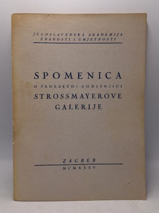 Spomenica o pedesetoj godišnjici Strossmayerove galerije Stranica: 80Dimenzije: 17x24Jezik: ZagrebPismo: LatinicaStanje: Vrlo dobroUvez: MekiGodina: 1935