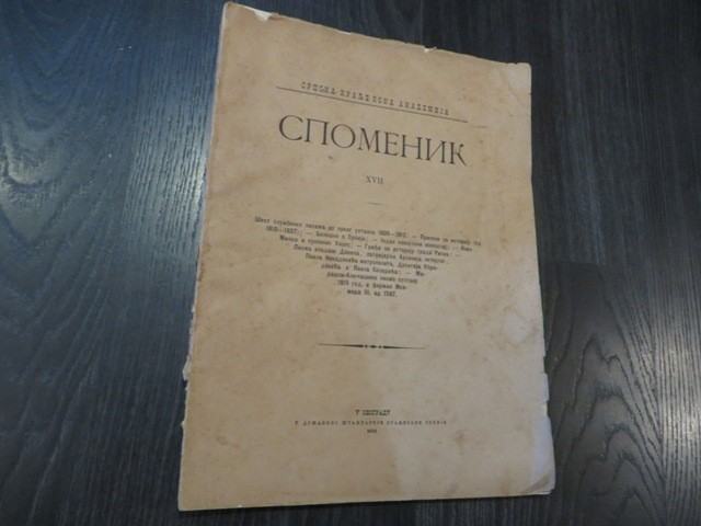 Spomenik XVII/1892 Stranica: 138Dimenzije: 23.5x31.5Jezik: BeogradPismo: ĆirilicaStanje: DobroUvez: MekiGodina: 1892