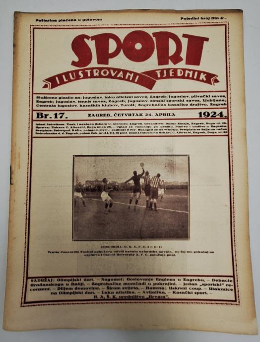 Sport - ilustrovani tjednik br. 17/1924.Odgovorni urednik: Dušan Zinaja “Sport- ilustrovani tjednik jedina je sportska smotra u Jugoslaviji koja donosi slike najaktualnijih domaćih i vanjskih događaja u sportskom životu.”Stranica: 12Dimenzije: 23x31Jezik: ZagrebPismo: LatinicaStanje: Vrlo dobroUvez: MekiGodina: 1924