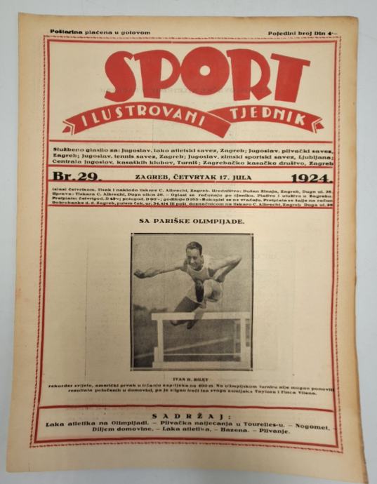 Sport - ilustrovani tjednik br. 29/1924.Odgovorni urednik: Dušan Zinaja “Sport- ilustrovani tjednik jedina je sportska smotra u Jugoslaviji koja donosi slike najaktualnijih domaćih i vanjskih događaja u sportskom životu.”Stranica: 12Dimenzije: 23x31Jezik: ZagrebGodina: 1924