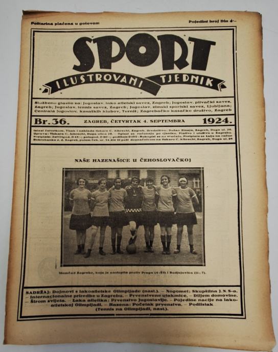 Sport - ilustrovani tjednik br. 36/1924.Odgovorni urednik: Dušan Zinaja “Sport- ilustrovani tjednik jedina je sportska smotra u Jugoslaviji koja donosi slike najaktualnijih domaćih i vanjskih događaja u sportskom životu.”Stranica: 12Dimenzije: 23x31Jezik: ZagrebPismo: LatinicaStanje: Vrlo dobroUvez: MekiGodina: 1924