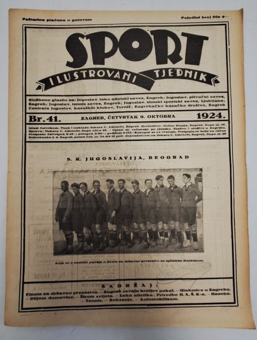 Sport - ilustrovani tjednik br. 41/1924.Odgovorni urednik: Dušan Zinaja“Sport- ilustrovani tjednik jedina je sportska smotra u Jugoslaviji koja donosi slike najaktualnijih domaćih i vanjskih događaja u sportskom životu.”Stranica: 12Dimenzije: 23x31Jezik: ZagrebPismo: LatinicaStanje: Vrlo dobroUvez: MekiGodina: 1924