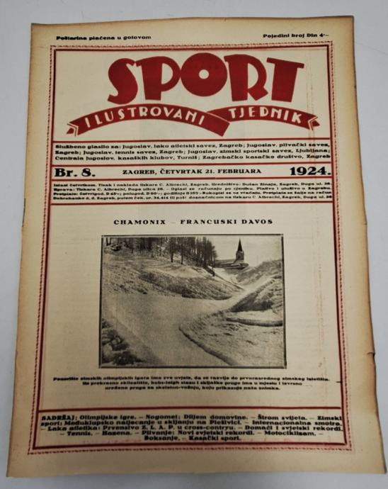 Sport - ilustrovani tjednik br. 8/1924.Odgovorni urednik: Dušan Zinaja “Sport- ilustrovani tjednik jedina je sportska smotra u Jugoslaviji koja donosi slike najaktualnijih domaćih i vanjskih događaja u sportskom životu.”Stranica: 12Dimenzije: 23x31Jezik: ZagrebPismo: LatinicaStanje: Vrlo dobroUvez: MekiGodina: 1924