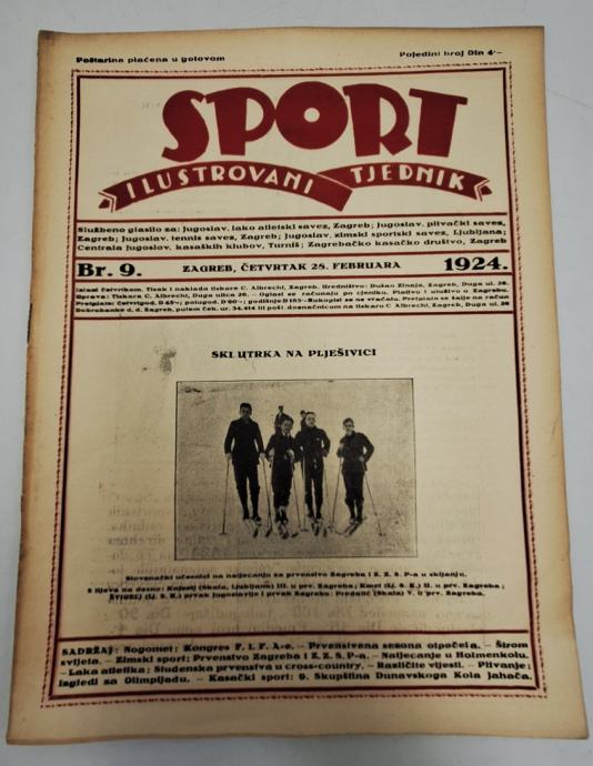 Sport - ilustrovani tjednik br. 9/1924.Odgovorni urednik: Dušan Zinaja “Sport- ilustrovani tjednik jedina je sportska smotra u Jugoslaviji koja donosi slike najaktualnijih domaćih i vanjskih događaja u sportskom životu.”Stranica: 12Dimenzije: 23x31Jezik: ZagrebPismo: LatinicaStanje: Vrlo dobroUvez: MekiGodina: 1924