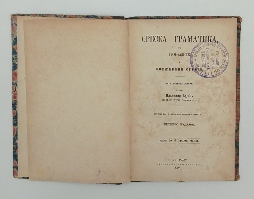 Vladimir Vujić: Srbska gramatika za gimnazije u Kneževini Srbiji Stranica: 100Dimenzije: 13x19Jezik: BeogradPismo: ĆirilicaStanje: DobroUvez: TvrdiGodina: 1871
