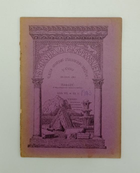 Starohrvatska prosvjetaGlasilo Hrvatskog starinarskog družtva u KninuUrednik Frano RadićGodina VII. sv. 1Sadržaj:D.Preradović, F.Radić: Crkva Sv.Stjepana Prvomučenika u Sustjepanu na Rieci dubrovačkojF.Radić: Tragovi crkvice na Lopuškoj glavici u Biskupiji kod KninaF.Radić: Dva rukopisna evangelijarna u Trogiru Stranica: 47Dimenzije: 18.5x26Jezik: KninPismo: LatinicaStanje: DobroUvez: MekiGodina: 1903