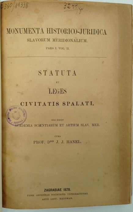 Jaromir J. Hanel:Statuta et leges civitatis Spalati Stranica: 336Dimenzije: 17x23Jezik: ZagrebPismo: LatinicaStanje: Vrlo dobroUvez: TvrdiGodina: 1878