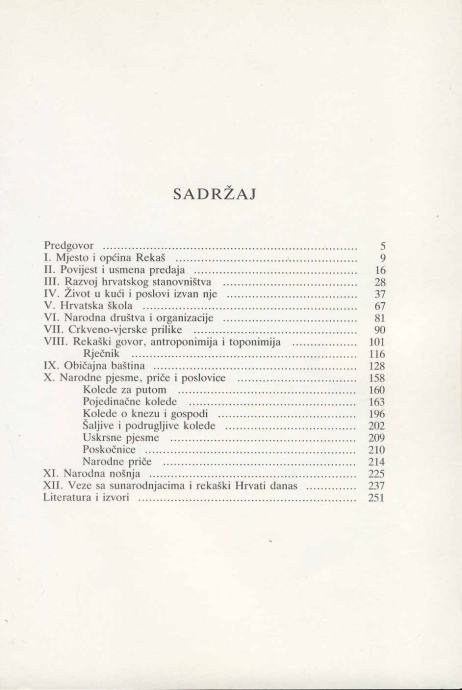 Knjiga je podijeljena na dvanaest poglavlja. Kraći opis mjesta i općine sa sjedištem u Rekašu zaprema prvo poglavlje, u drugom i trećem čitatelj će se upoznati s podacima koje o Rekašunude povijest i usmena predaja te s razvojem hrvatskog stanovništva. Životna svakodnevnica u kući, poljski i drugi poslovi kojima se donedavno isključivo bavio naš tamošnji svijet, predstavljeni su u četvrtom poglavlju, dok su tri iduća dijela posvećena hrvatskoj školi, narodnim društvima i organizacijama te crkveno - vjerskim prilikama. U osmom poglavlju čitalac će se upoznati s rekaškim govorom te antroponimijom i toponimijom. Običajna baština, rekaško usmeno-književno blago te opis narodne nošnje, raspoređeni su u devetom, desetom i jedanaestom poglavlju.
