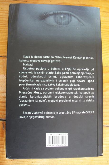 Kada je dobio karte za Nebo, Nernst Kokran je mislio kako su njegove nevolje gotove...Naivac!Usputna posjeta u bolnici, u kojoj se oporavlja od cijene koju je za njih platio, šalje ga niz perivoje sjećanja, u čudni, odmaknuti svijet, uglavnom zaboravljenih izopćenika, nerazumljivih i stranih gdje stvari Ispod površine nikada nisu takve kakvima izgledaju.A čak ni kada sa svojom voljenom Igri napokon stiže na Mjesečev Most, ogromni elektromagnetski katapult za slanje kolonizacijskih brodova u duboki svemir “ubrzanjem iz nule“, njegovi problemi nisu ni iz daleka gotovi...Zoran Vlahović dobitnikje prestižne SF nagrafe SFERA i ovo je njegov drugi roman.