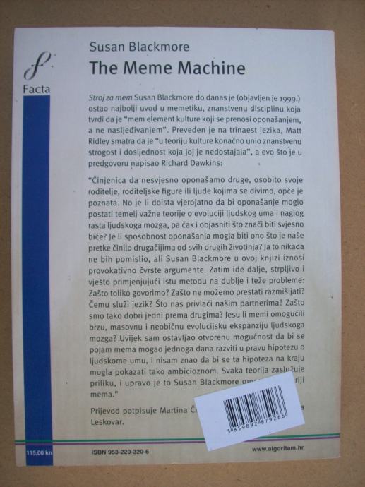 “Činjenica da nesvjesno oponašamo druge, osobito svoje roditelje, roditeljske figure ili ljude kojima se divimo, opće je poznata. No je li doista vjerojatno da bi oponašanje moglo postati temelj važne teorije o evoluciji ljudskog uma i naglog rasta ljudskoga mozga, pa čak i objasniti što znači biti svjesno biće? Je li sposobnost oponašanja mogla biti ono što je naše pretke činilo drugačijima od svih drugih životinja? Ja to nikada ne bih pomislio, ali Susan Blackmore u ovoj knjizi iznosi provokativno čvrste argumente.