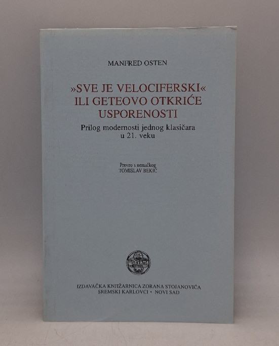 Manfred Osten: "Sve je velociferski" ili Geteovo otkriće usporenostiPrilog modernosti jednog klasičara u 21. vekuIskustvo s modernim neograničeno ubrzanim životom u znaku napretka Valter Benjamin je (u svom tumačenju slike Paula Kleea Angelus Novus kao anđela povijesti) sveo na sljedeću formulu: “Tamo gdje se suočavamo s jednim lancem događaja, mi se zapravo suočavamo s neprekidnim nizom katastrofa iza kojih se gomila ruševina za ruševinom. On bi zasigurno htio tome stati na kraj, da probudi mrtve i razbijeno sklopi u cjelinu. Ali iz raja puše vjetar koji se zapleo u njegovim krilima, a pri tome je toliko jak da anđeo više nije u stanju sklopiti krila. Taj vjetar ga nezadrživo goni u budućnost, kojoj okreće leđa, dok gomila ruševina pred njim raste u nebo”.Stranica: 132Dimenzije: 11x18Jezik: Novi SadPismo: LatinicaStanje: Nova knjigaUvez: MekiGodina: 2005
