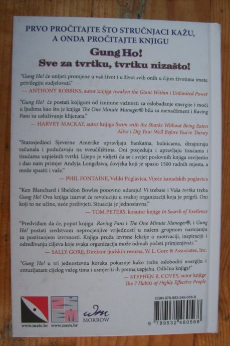 K. Blanchard i S. Bowles, autori New York Times-ovog poslovnog best-sellera Raving Fans,vratili su se s knjigom Gung Ho.! Ova je knjiga menadžersko sredstvo neprocjenjive vrijednosti i predstavlja sigurne načine na koje možete povećati produktivnost njegujući visoki moral na radnom mjestu. To je obvezno štivo za one koji žele ostati na vrhu u današnjem iznimno konkurentskom poslovnom svijetu. Tri principa Gung Ho-a su: vjeveričin duh, dabrov način i guskin dar. Ta tri načela su iznenađujuće jednostavna ali zadivljujuće snažna. Bilo da se vaša organizacija sastoji od jedne tvrtke koja je uvrštena na listu Fortune 500, ili je ona sama jedna od 500 najuspješnijih tvrtki, ova knjiga jamči stvaranje Gung Ho! zaposlenika odanih uspjehu. Knjiga također uključuje jasan plan igre i korak po korak objašnjava provođenje ovih pionirskih ideja. Osuđena da postane klasik, Gung Ho! je rijetka i izvrsna poslovna knjiga koja sadrži informacije neprocjenjive vrijednost, te zanimljivu i napetu priču.