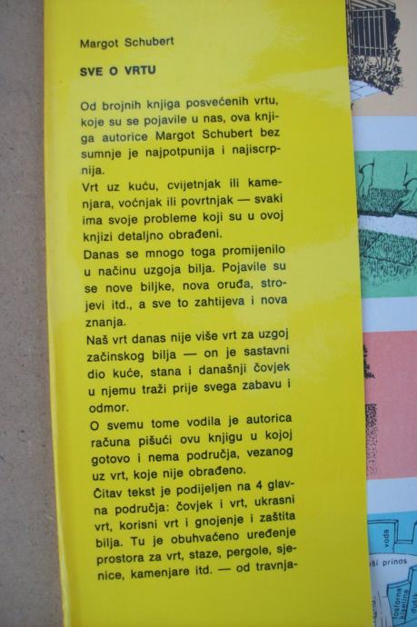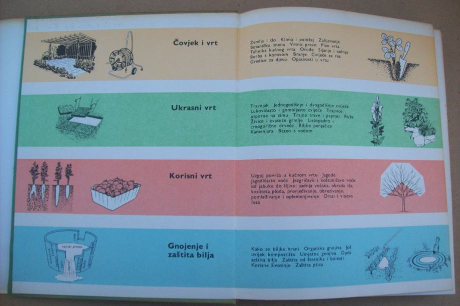 Osnovna funkcija bašte nije više ekonomska, vrt je sada sastavni deo kuće, služi za zabavu i odmor. Sadržaj ove knjige od 400 strana podeljen je u četiri celine. Prva, „Čovjek i vrt“, daje osnove za planiranje i oblikovanje baštenskog prostora, sa cvetnim gredicama, stazama i svim drugim vrtnim elementima. Govori se o zemljištu, vodi, klimi. Zatim, o baštenskom alatu, setvi, sadnji i načinima suzbijanja korova.