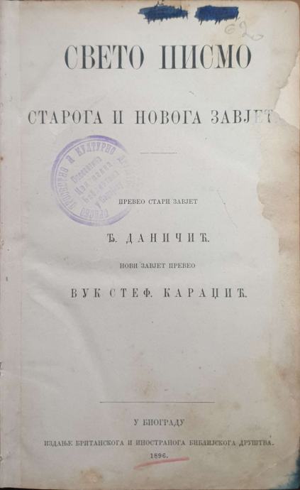 Sveto Pismo Staroga i Novoga ZavjetaPreveo Stari Zavjet: Djuro DančićNovi Zavjet preveo Vuk Stef. Karadžić