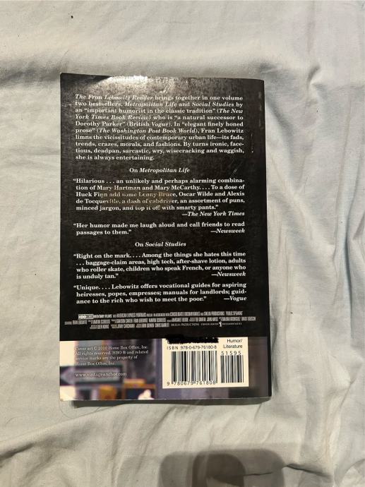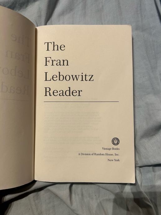 Prodajem knjigu The Fran Lebowitz Reader, izdanje Vintage Books (Random House). Radi se o zbirci koja u jednom svesku okuplja dva Lebowitzina bestselera, Metropolitan Life i Social Studies. Knjiga je pisana na engleskom jeziku.