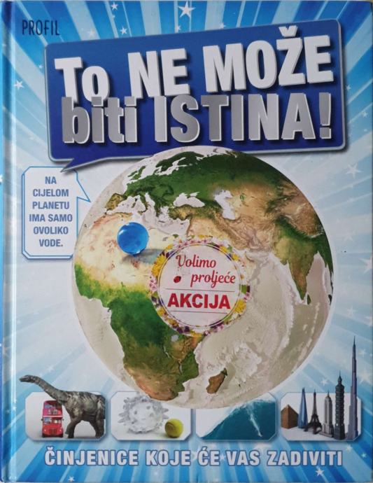 To ne može biti istina!Ova nevjerojatna knjiga donosi zadivljujuće podatke o svemiru, planetima, životinjama, ljudima, Zemlji, građevinama i automobilima. I onda ih međusobno uspoređuje realističnim ilustracijama. Tako predstavljeni podaci i zanimljivosti lako se pamte te će djeca bolje shvatiti odnose u svijetu koji ih okružuje. Ova je knjiga namijenjena djeci, ali se i odrasli mogu zabavljati čitajući je zajendo s djecom. Koliko je veliko Sunce, koji je najveći kanjon, koja je najteža tvar u svemiru, koliko je brza svjetlost, koji je najveći kontinent, koje je najveće jezero, koja je špilja najveća, koliko vode ima na Zemlji i odgovore na mnoga druga pitanja otkrit će vam ova zanimljiva knjiga. Možete je čitati sprijeda, straga, nasumičnim otvaranjem, a na svakoj je stranici jednako zabavna i fascinantna.