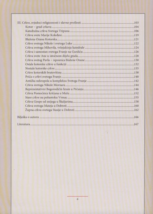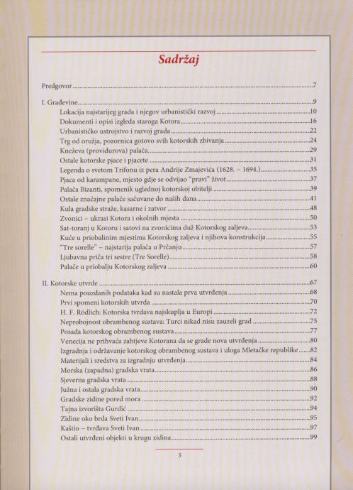 Knjiga novinara i publicista, rođenoga Kotoranina, bogata je publicistička monografija Kotora i okolice, sa sustavnim opisom povijesnih činjenica temeljenih na arhivskoj građi, ali i s raznolikim bogatstvom svjedočanstava kulturnoga i duhovnog života Boke kotorske. Građa knjige raspoređena je u tri poglavlja koja su naslovljena: Građevine, Kotorske utvrde i Crkve, svjedoci religioznosti i slavne prošlosti.