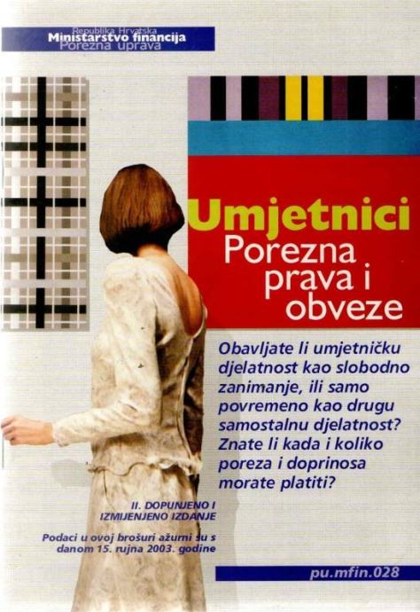 Umjetnici- porezna prava i obveze II. dopunjeno i izmijenjeno izdanje Stranica: 40Jezik: zagrebPismo: LatinicaStanje: Nova knjigaUvez: MekiGodina: 2003