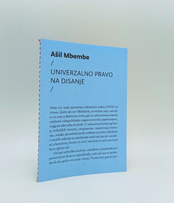 Achille Mbembe: Univerzalno pravo na disanje "Ono što nam treba je dobrovoljna i svjesna stanka, stanka s punim konsenzusom. Bez njega teško da možemo imati sutra. "(pismo iz karantene, ožujak 2020)Kamerunski filozof i politički teoretičar čije su glavne teme istraživanja afrička povijest, postkolonijalne studije, politika i društvene znanosti. Iako ga nazivaju postkolonijalnim teoretičarem, nedavno je temeljito odbacio tu oznaku, jer svoj projekt vidi kao prihvaćanje i nadilazak različitosti, a ne povratak u izvornu, marginalnu, nemetropolitansku domovinu.Stranica: 15Dimenzije: 10x15Jezik: BeogradPismo: LatinicaStanje: Nova knjigaUvez: MekiGodina: 2020