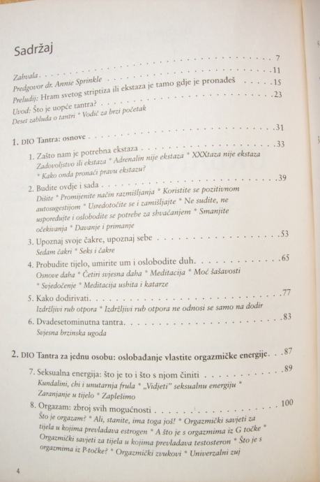 Otvorene oči, duboko disanje i osjećaj za avanturu - samo to dovoljno je da se krene na putovanje istraživanja seksa i prosvjetljenja kakvo obećava tantra. “Urbana tantra” Barbare Carrellas knjiga je nastala na seksualnim tečajevima i radionicama pod nazivom “Erotsko buđenje”, koje je autorica pohađala i organizirala širom SAD-a i Australije, jer je zaključila, kako kaže, da je mnogo jednostavnije istraživati seks u zemlji koju su osnovali robijaši nego u onoj koju su osnovali puritanci.