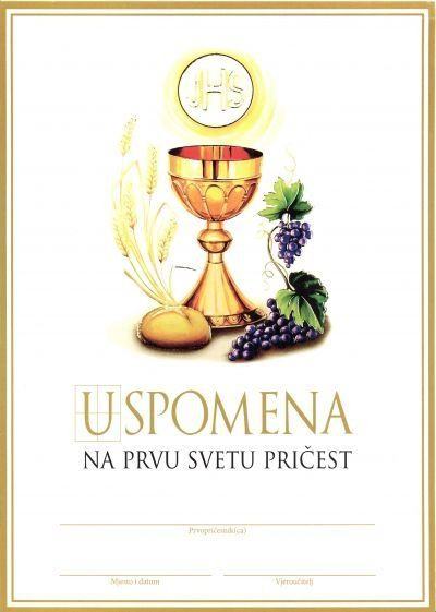 Uspomena na primljeni sakrament, tiskana na kvalitetnom bindacot papiru dimenzija A4. Na zahtjev župnih ureda i vjeroučitelja na uspomene možemo ISPISATI i IMENA i ostale podatke. Ispis radimo na kvalitetnom laserskom pisaču, a cijena ispisa je 0,50 kn po primjerku. Ukoliko želite da uspomene i uokvirimo, molimo javite nam telefonom ili kontaktirajte djelatnike Vama najbliže knjižare Verbum kako bi odabrali okvir iz naše ponude. Cijena uokvirivanja iznosi 39,00 kn.