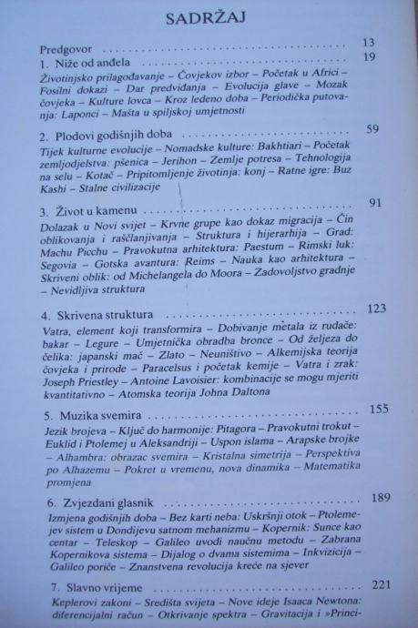 Knjiga obuhvaća povijest znanosti u najširem smislu, kao izraz posebne čovjekove sposobnosti da razumije prirodu i ovlada njoime. Znanost je ovdje uključena u povijesni i društveni kontekst, pa je knjiga ujedno i povijest ideja, čime se otvaraju i civilizacijski vidici. Autor je iskoristio priliku koja se pruža znanosti da zasnuje filozofiju prirode. Otkrića u biologiji čovjeka dala su nov smjer znanstvenoj misli – ona se prvi put, nakon što je renesansa otvorila vrata prema prirodi, od općega okrenula onome što je individualno. Izvanredno jasno pisana knjiga ilustrirana je stotinama crno-bijelih i kolor fotografija koje se skladno uklapaju u autorovu humanu koncepciju.
