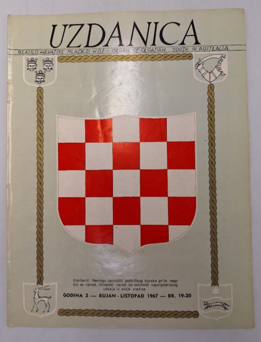 Uzdanica br. 19-20/1967. (emigracija)glasilo hrvatske mladeži Odgovorni urednik: Ante SarićStranica: 20Dimenzije: 22x28Jezik: AustralijaPismo: LatinicaStanje: Vrlo dobroUvez: MekiGodina: 1967