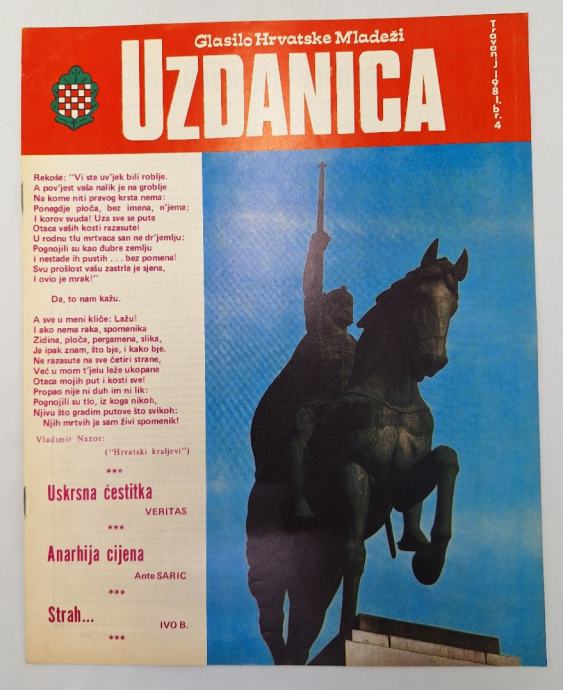 Uzdanica br. 4/1981. (emigracija)glasilo hrvatske mladeži Odgovorni urednik: Ante SarićStranica: 20Dimenzije: 22x28Jezik: AustralijaPismo: LatinicaStanje: Vrlo dobroUvez: MekiGodina: 1981